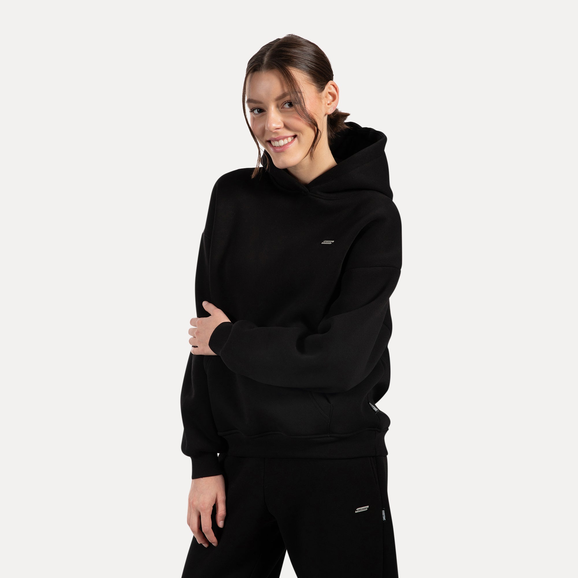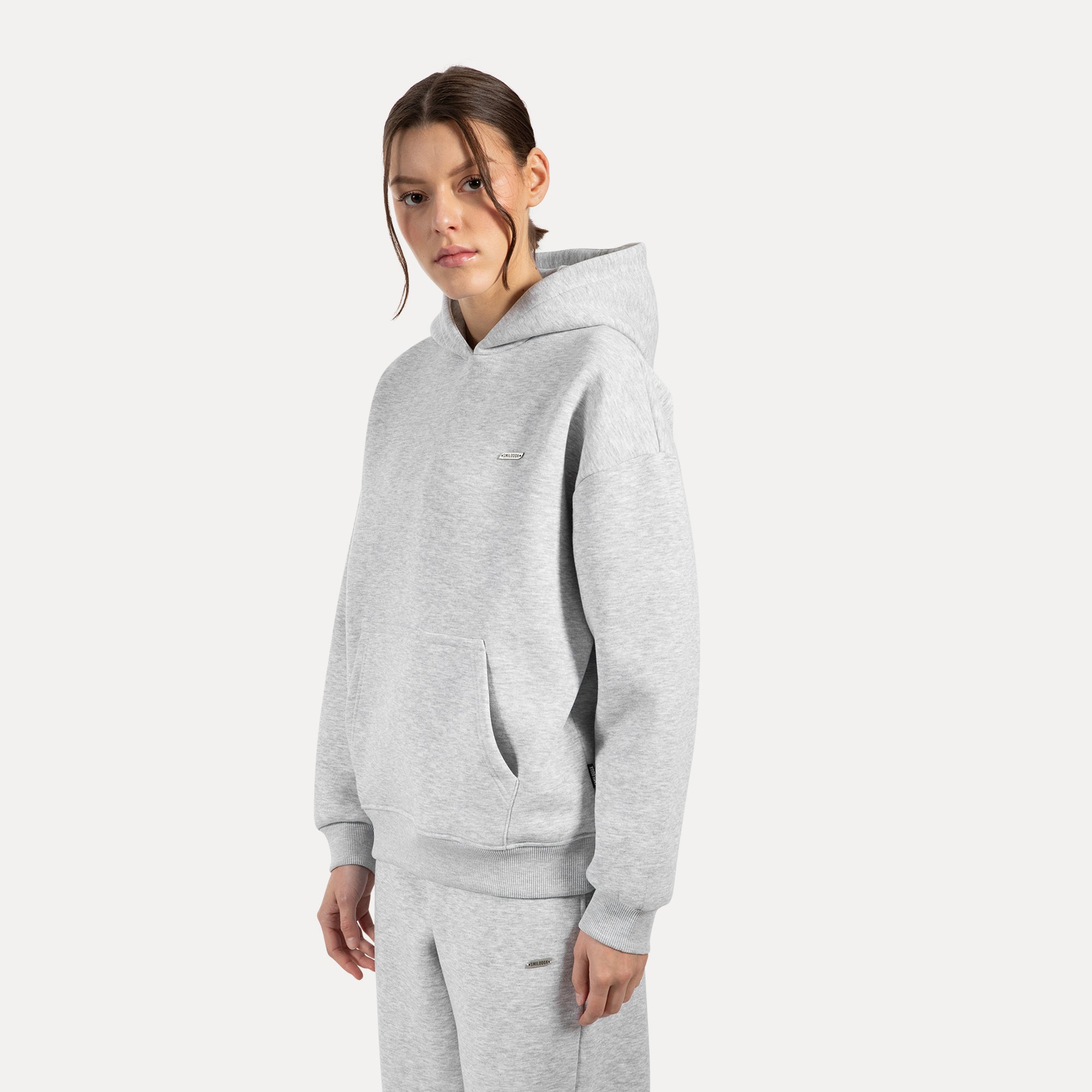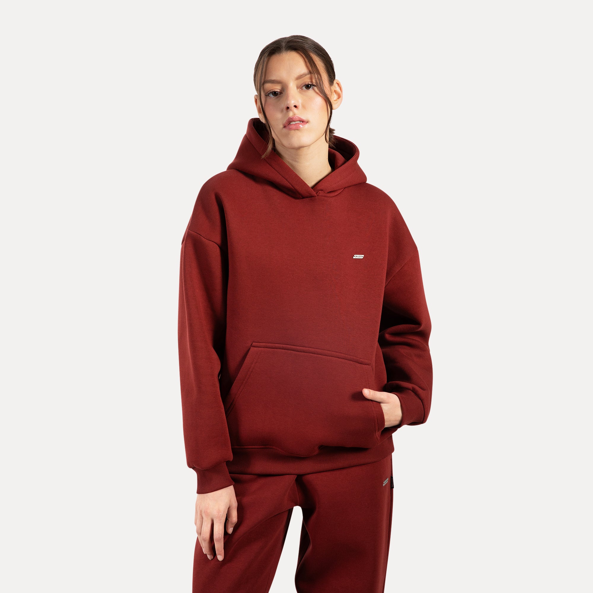 Unser Hoodie für Damen ist das perfekte Kleidungsstück für kühle Tage und gemütliche Stunden. Der weiche, flauschige Stoff fühlt sich unglaublich angenehm auf der Haut an und spendet wohlige Wärme. Mit seinem lässigen Oversized-Schnitt und der großen Kapuze umhüllt er dich stilvoll und bequem. Praktische Bündchen an den Ärmeln und am Saum sorgen für einen perfekten Sitz, während die aufgesetzte Kängurutasche Platz für kalte Hände oder kleine Essentials bietet. Ein fein graviertes Metallabel auf der Brust verleiht dem minimalistischen Design eine edle Note und macht den Hoodie zu einem besonderen Lieblingsstück.