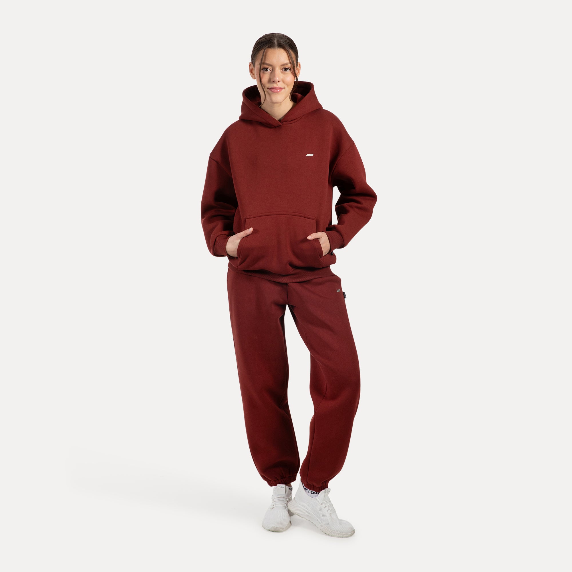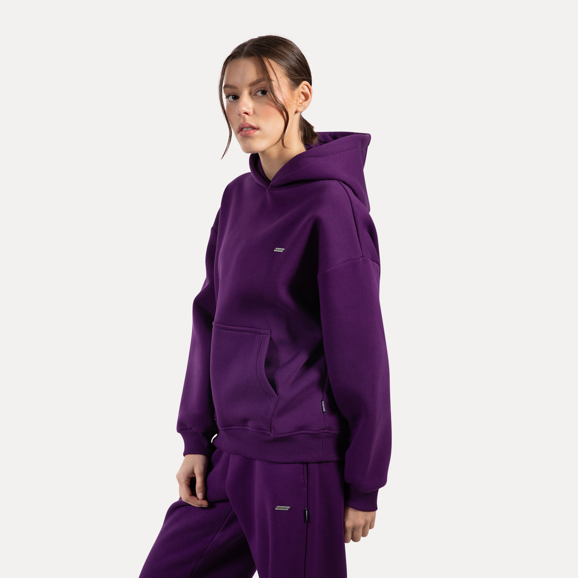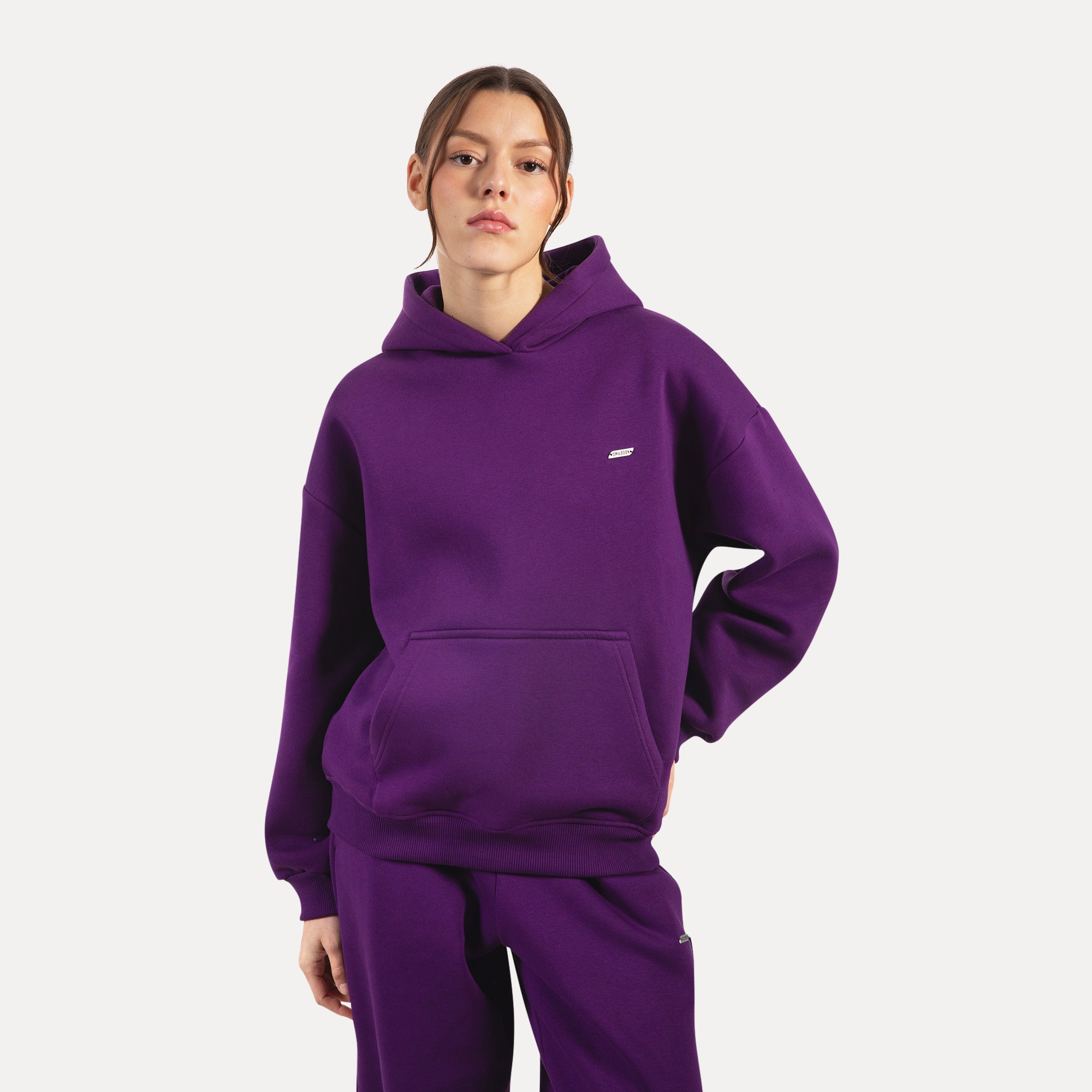Unser Hoodie für Damen ist das perfekte Kleidungsstück für kühle Tage und gemütliche Stunden. Der weiche, flauschige Stoff fühlt sich unglaublich angenehm auf der Haut an und spendet wohlige Wärme. Mit seinem lässigen Oversized-Schnitt und der großen Kapuze umhüllt er dich stilvoll und bequem. Praktische Bündchen an den Ärmeln und am Saum sorgen für einen perfekten Sitz, während die aufgesetzte Kängurutasche Platz für kalte Hände oder kleine Essentials bietet. Ein fein graviertes Metallabel auf der Brust verleiht dem minimalistischen Design eine edle Note und macht den Hoodie zu einem besonderen Lieblingsstück.